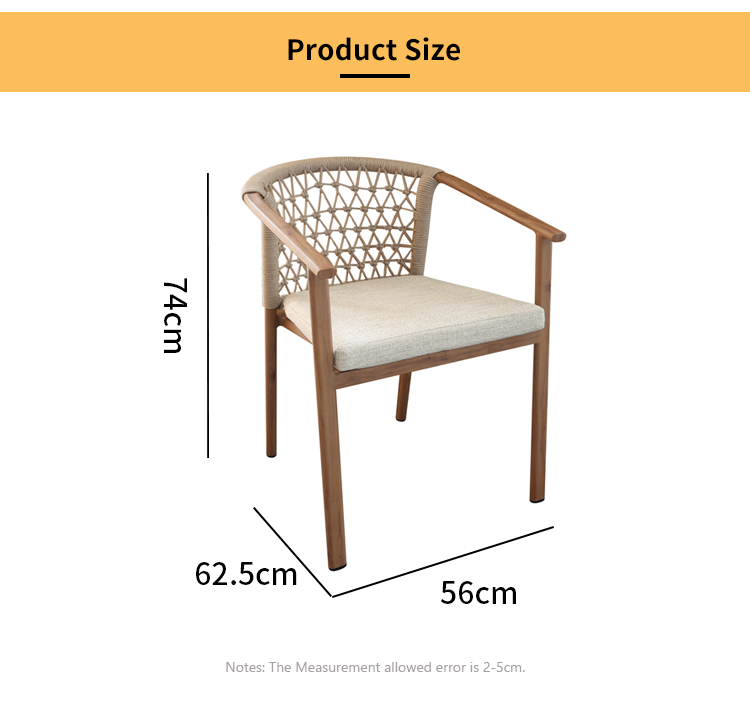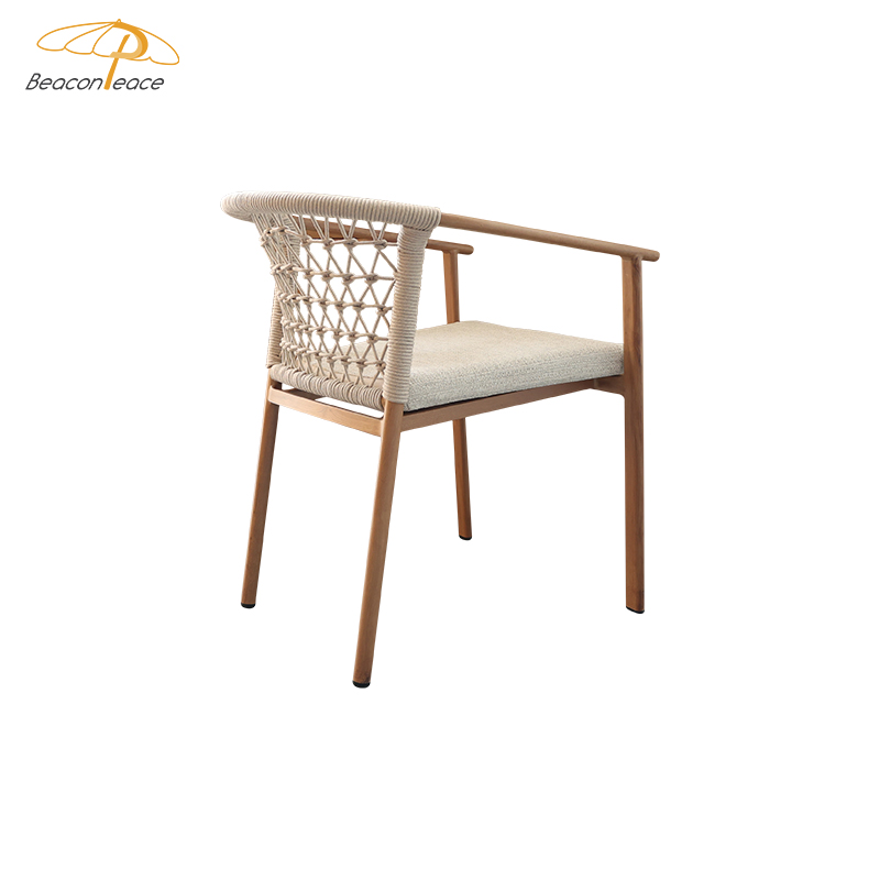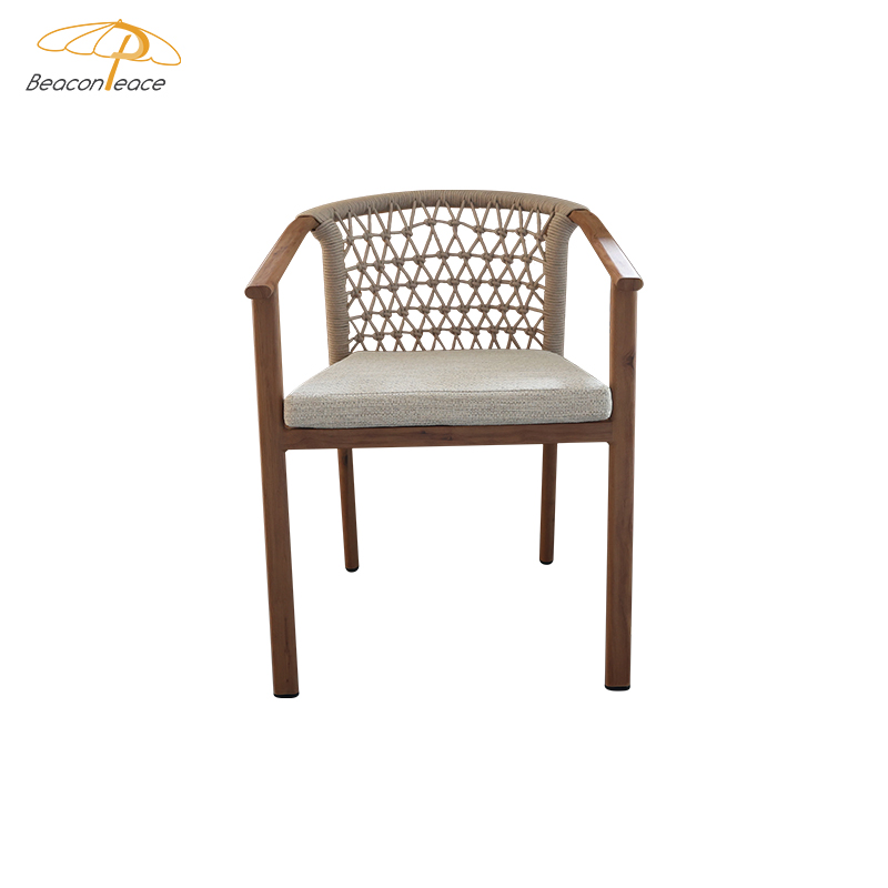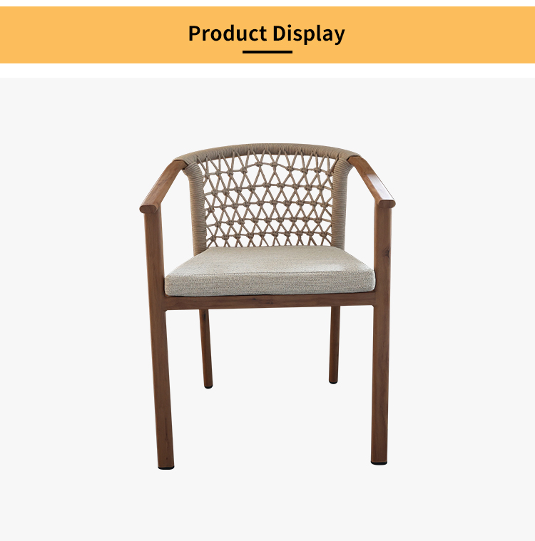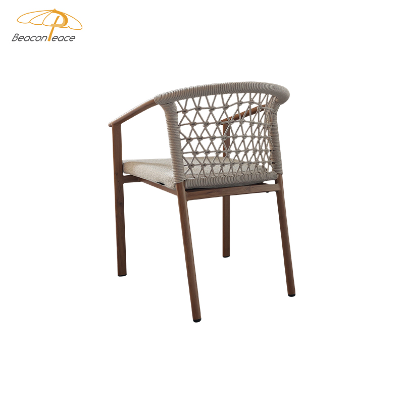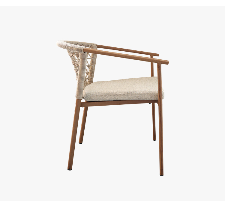 This outdoor aluminum alloy chair is based on an aluminum alloy thermal transfer wood color frame, which not only shows the warmth of natural wood grain, but also has the lightness and durability of aluminum alloy. The armrests are designed to be comfortable and provide better support, while the exquisite rattan decoration on the back adds a touch of elegance and fashion. Whether in an outdoor restaurant or coffee shop, this chair brings comfort and unique aesthetics to your space, perfectly integrating into every moment of relaxation.