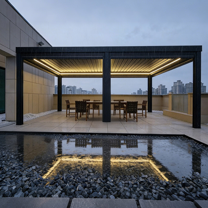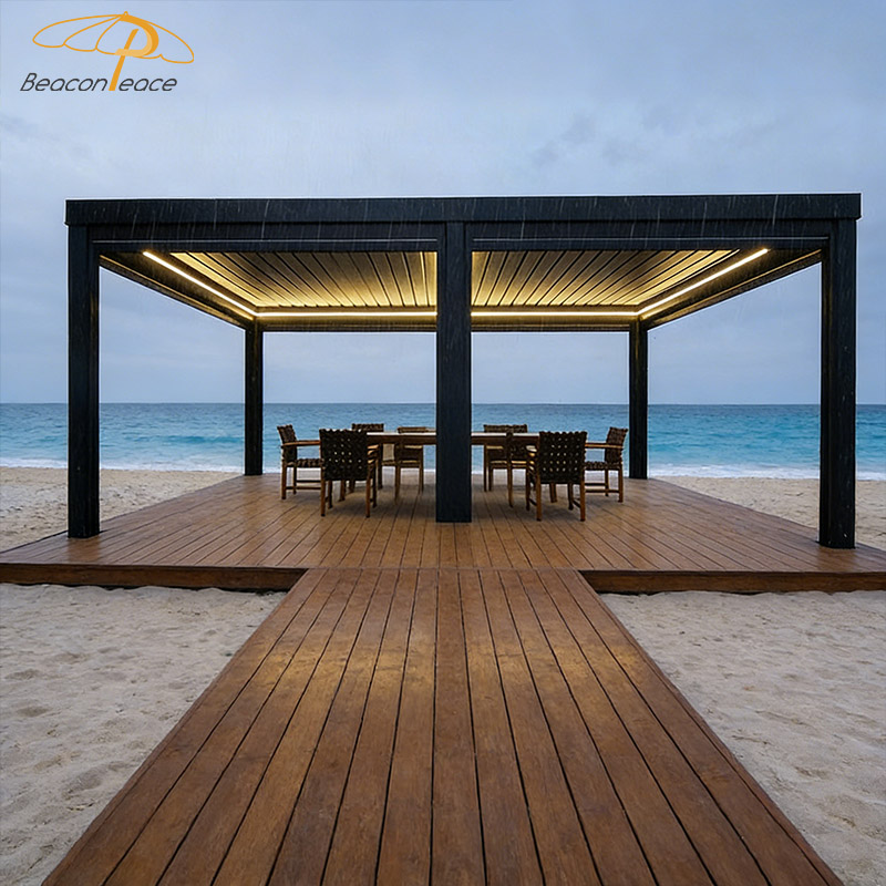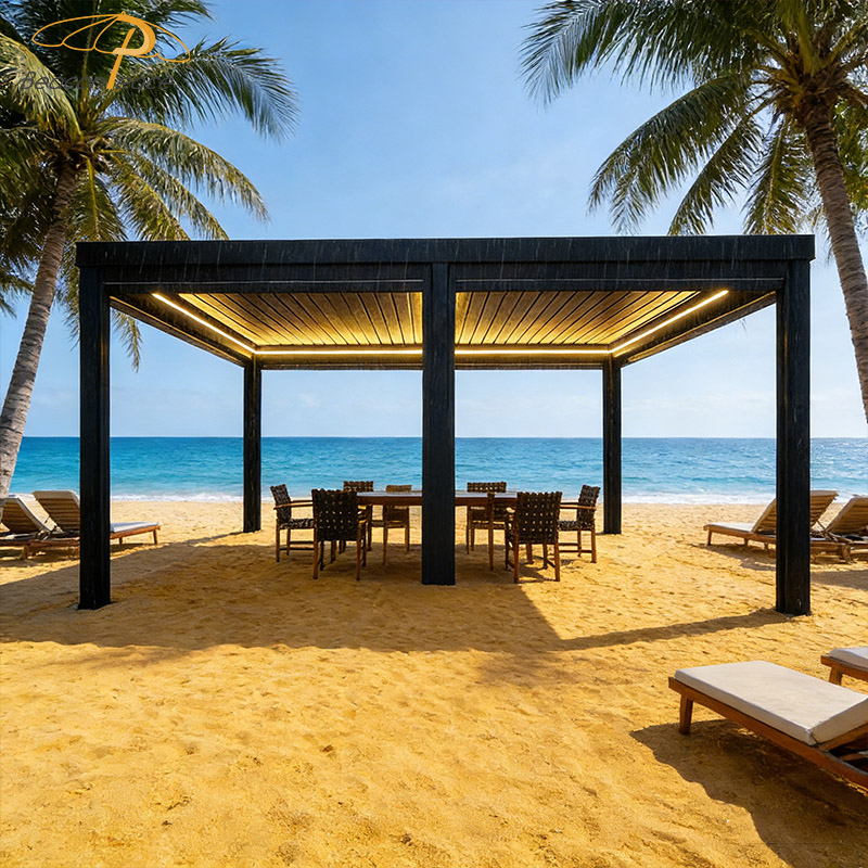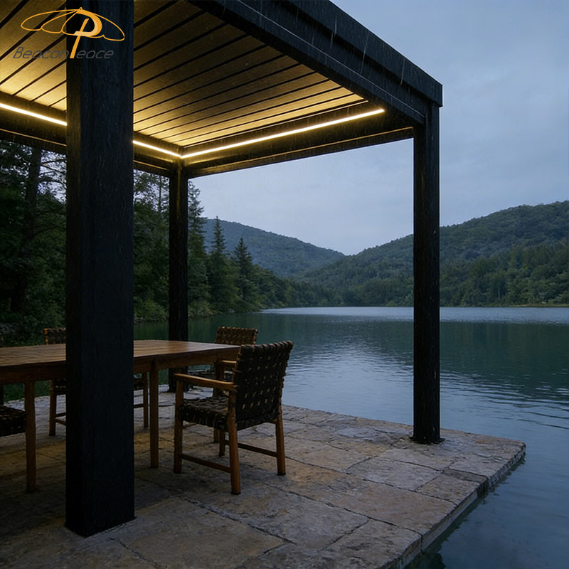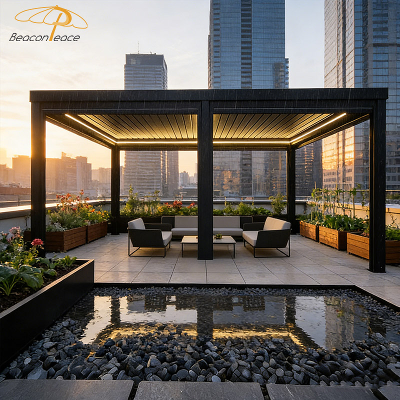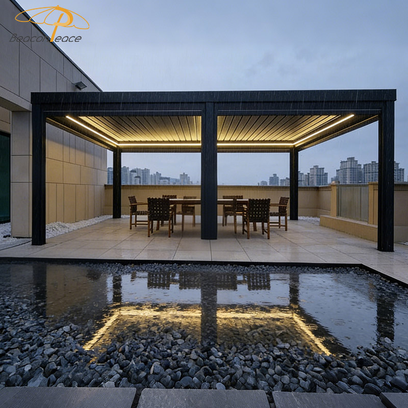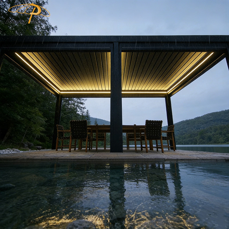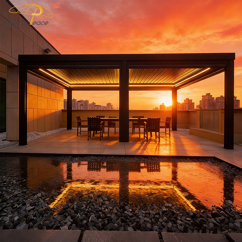 This BP8712 aluminum louvered roof gazebo adds elegance and practicality to your outdoor space. Constructed from high-quality aluminum alloy, this gazebo boasts excellent corrosion resistance and wind resistance, ensuring long-lasting use in various weather conditions. The unique louvered design allows for flexible adjustment of sunlight and ventilation, providing you with a comfortable and relaxing environment.