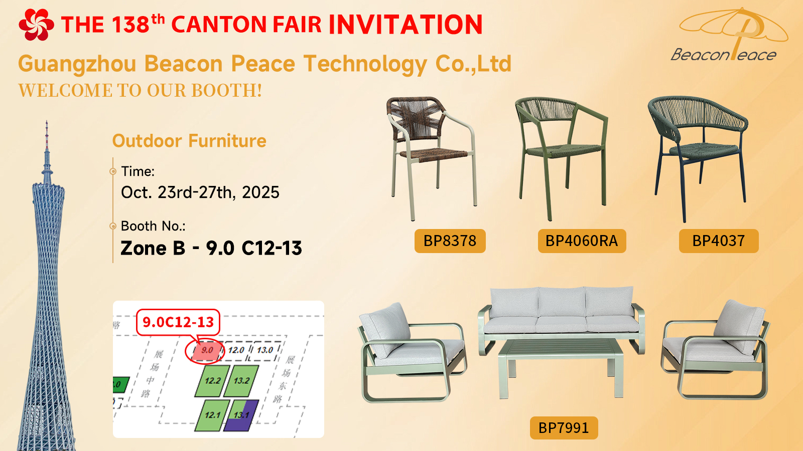 We are pleased to extend a sincere invitation to you to attend the upcoming 138th China Import and Export Fair (Canton Fair) from October 23 to 27, 2025. Beacon Peace Furniture, a leading company specializing in the design and manufacture of high-end outdoor furniture, will be showcasing a new series of outdoor sofas, dining tables, loungers, and more at this prestigious event.